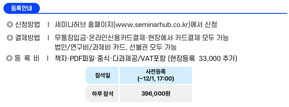 ① 무통장입금(세금계산서 발급) : IBK기업은행 988-028464-04-014 / 예금주 : 세미나허브