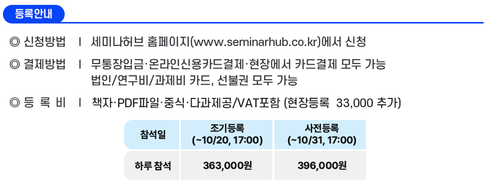※ 결제방법에서 '현장카드결제' 선택 후 세미나허브 사무국으로 전화주시기 바랍니다.(02-2088-6488)